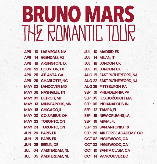 Here's how Bruno Mars' dates looked upon announcement. Notice the gaps between each city. Notice how each leg of the tour starts and ends with a major city. There is a month between Toronto and Paris, and between London and New Jersey (NYC's market). The new dates were already set in stone well in advance. I called this in my Presale Breakdown before a single show was added.